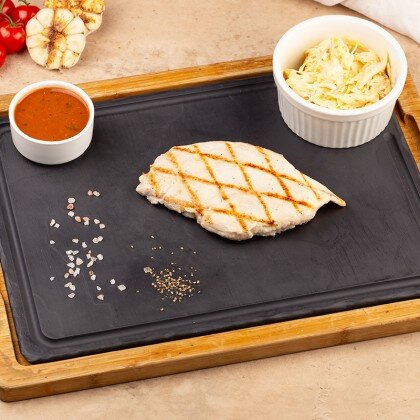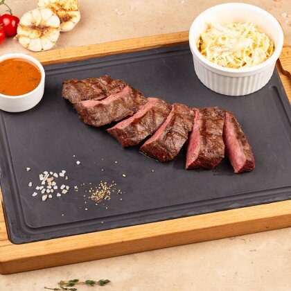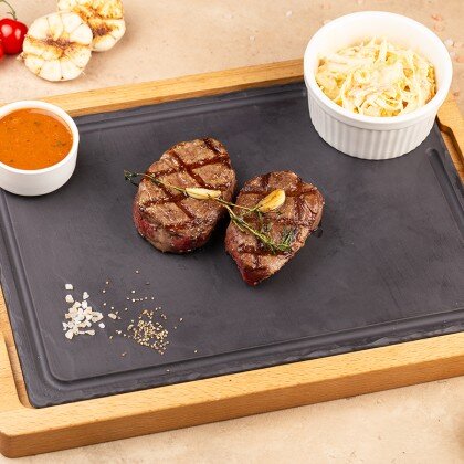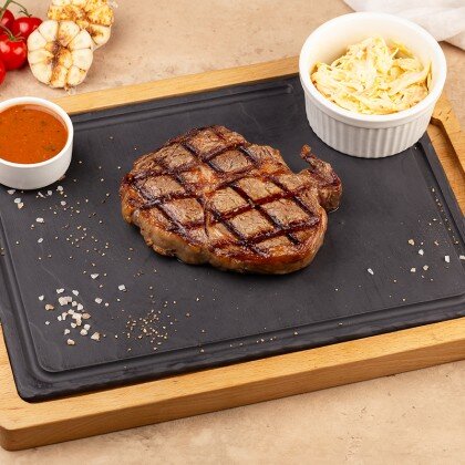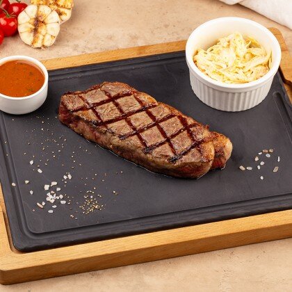 Премиальный стейк из поясничной части мраморной говядины, тонкий край, с ярким вкусом, подается с салатом Коул Слоу и томатным ворчестером Вес мяса в меню указан в сыром виде