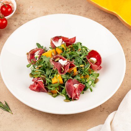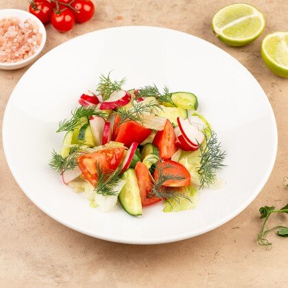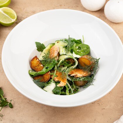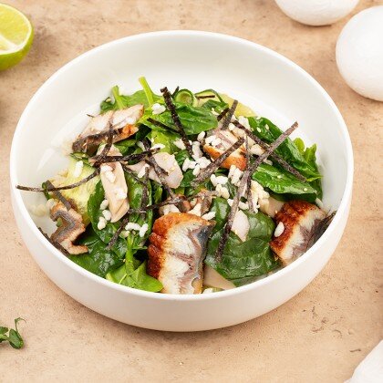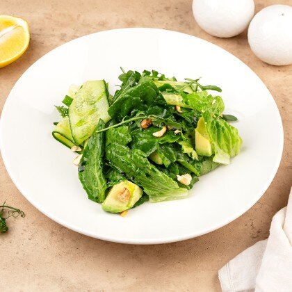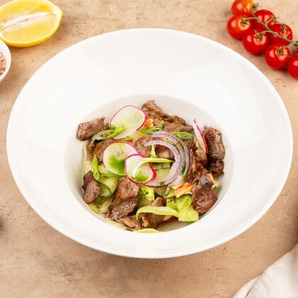 Нежная куриная печень, обжаренная до золотистой корочки, в сопровождении свежих ломтиков огурца, заправленных маслом и зеленым луком, воздушного микса сезонных салатов, пикантной заправки из устричного соуса и кунжута
